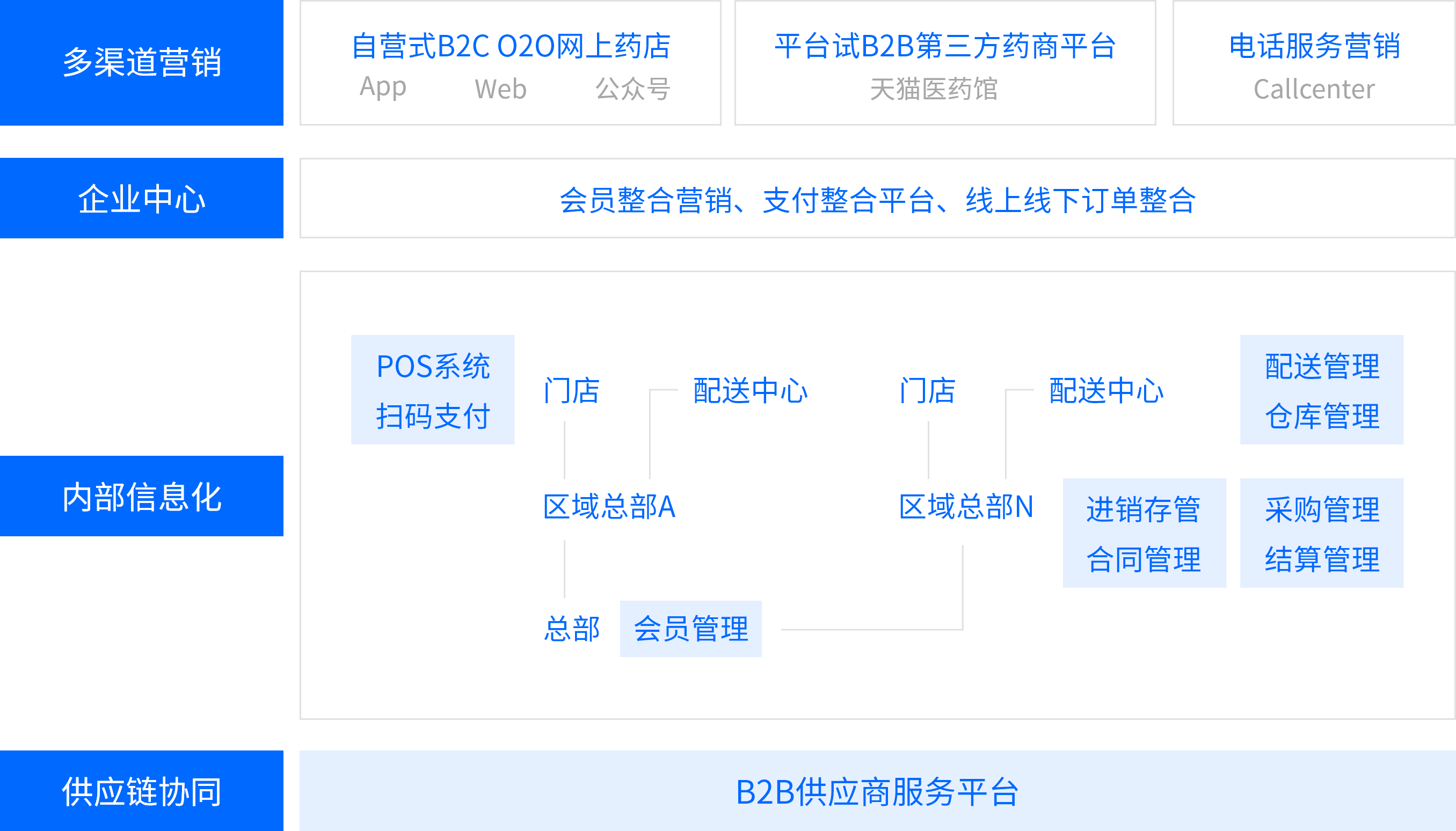 企业在线提供的的医药流通电商解决方案,通过搭建自营式B2C,O2O应用,